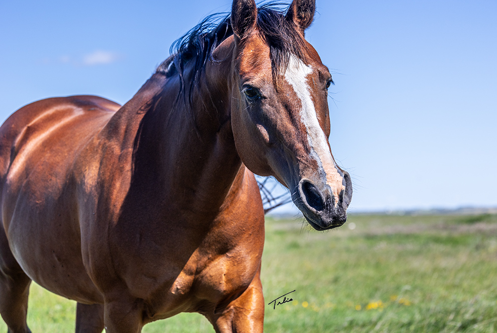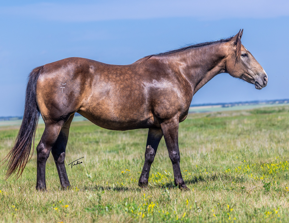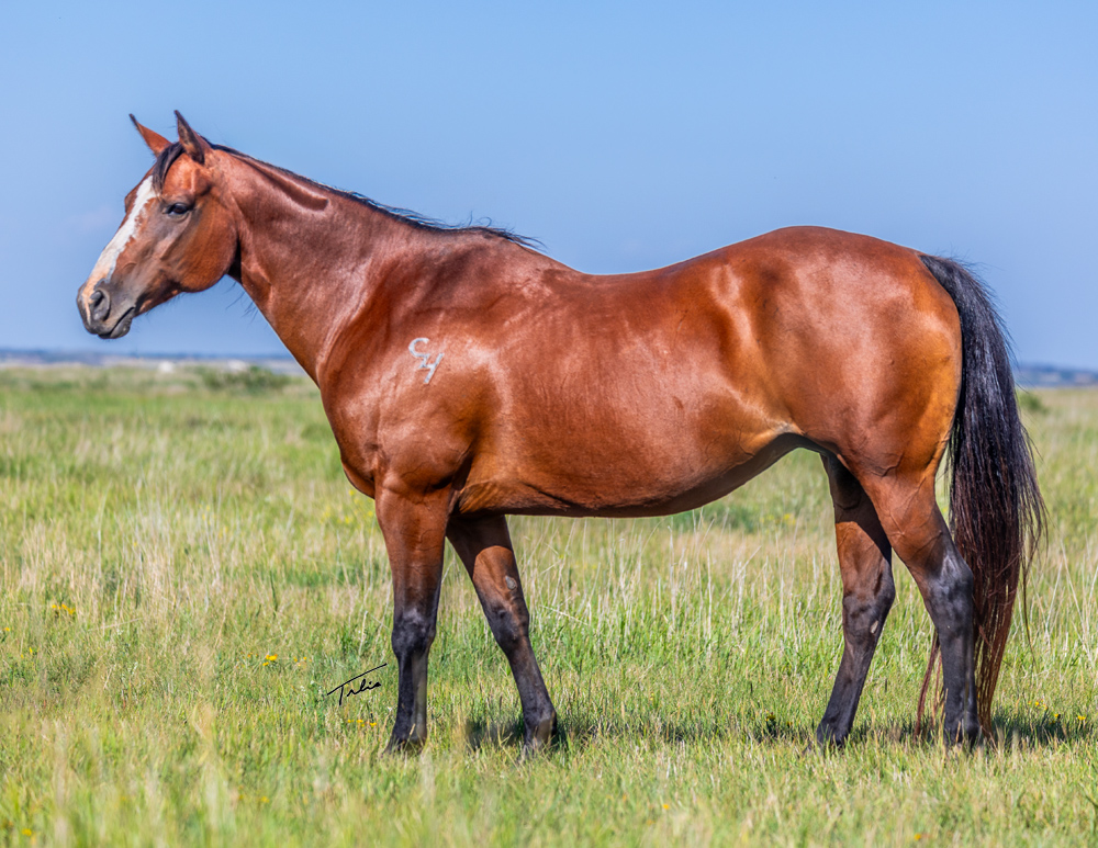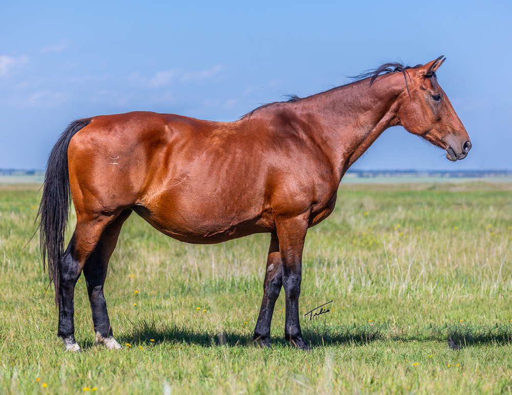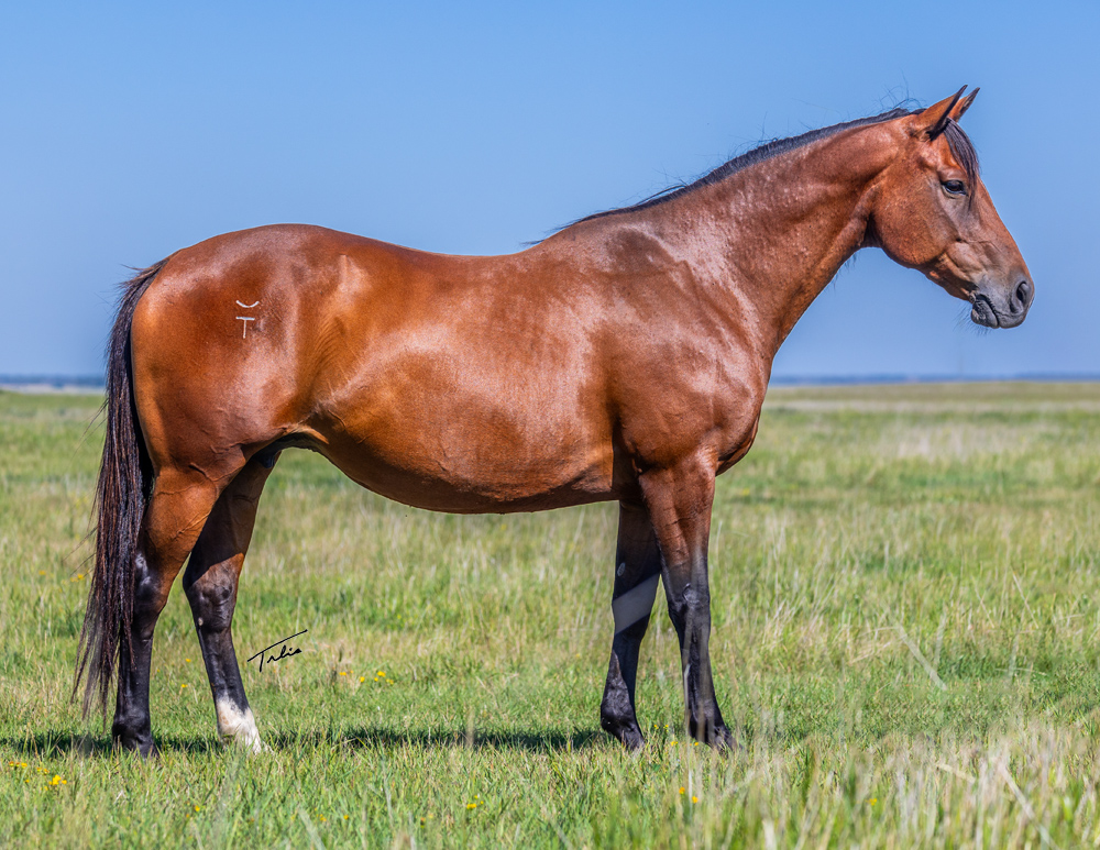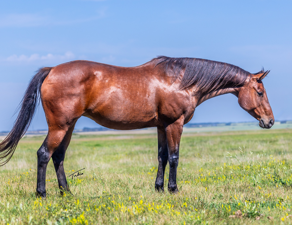 Don't let her size fool you—this big, soggy bay mare is a total sweetheart who is raising some phenomenal foals! "Tiny's" sire, Run Bully AA, has quickly proven himself as a sire across multiple disciplines, including siring the 2015 & 2016 Champion Heading Horses at the Manitoba Rope Horse Futurities. This comes as no surprise, given he is by the top-ranked Barrel Derby sire Bully Bullion (SI-104/AAAT/ROM/Superior), an AQHA Racing Champion and stakes winner with earnings of $225,384 and offspring earnings totaling $7,472,810. Run Bully is out of Sail Run (SI-98/AAAT), by Sail On Bunny SI-108/AAAT/ROM/Superior. In foal to TPR StreakN Goldmine for a 2026 foal.