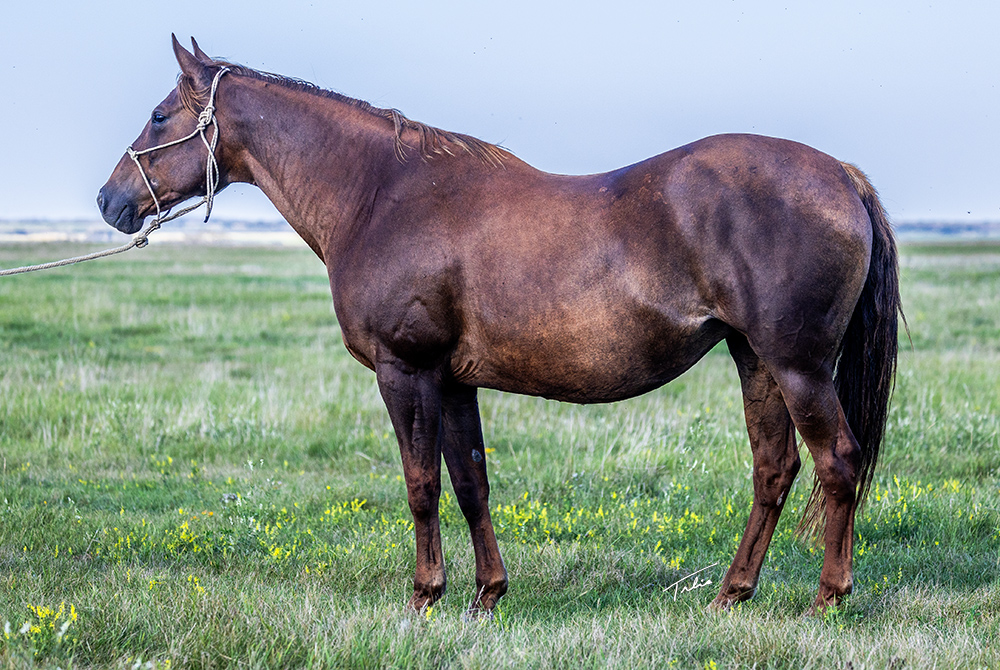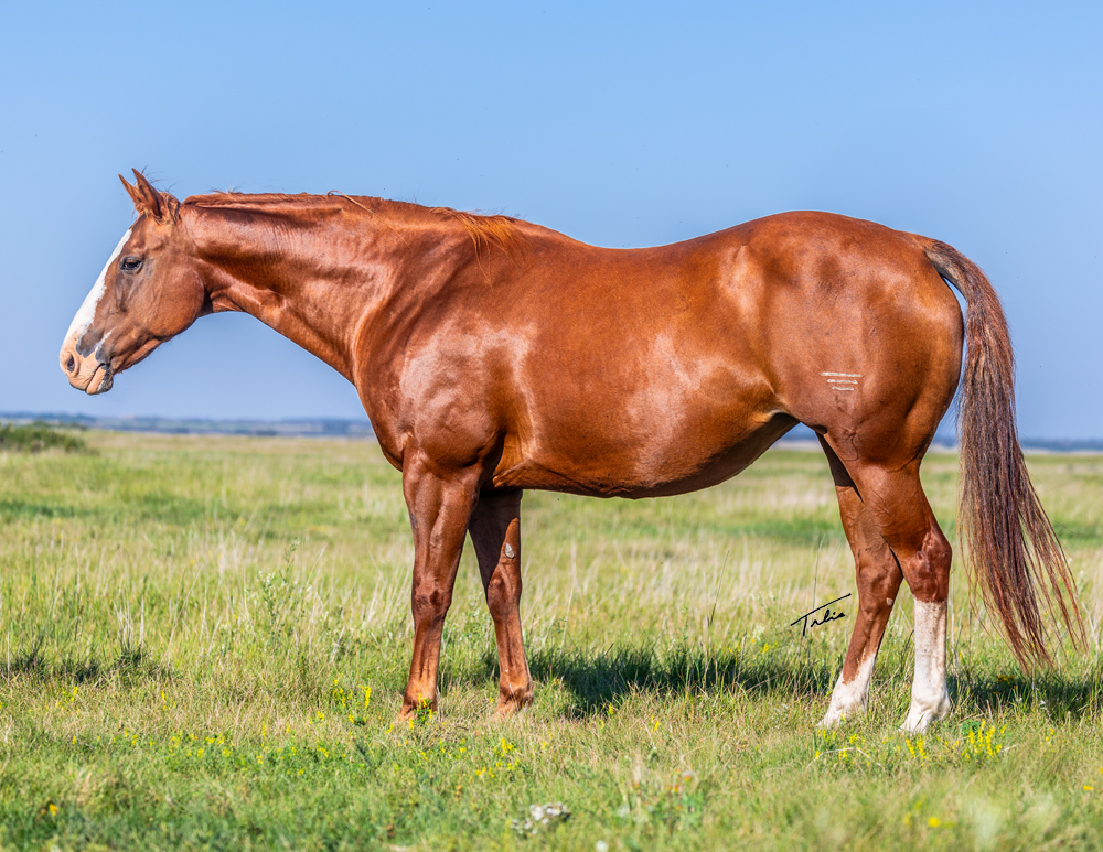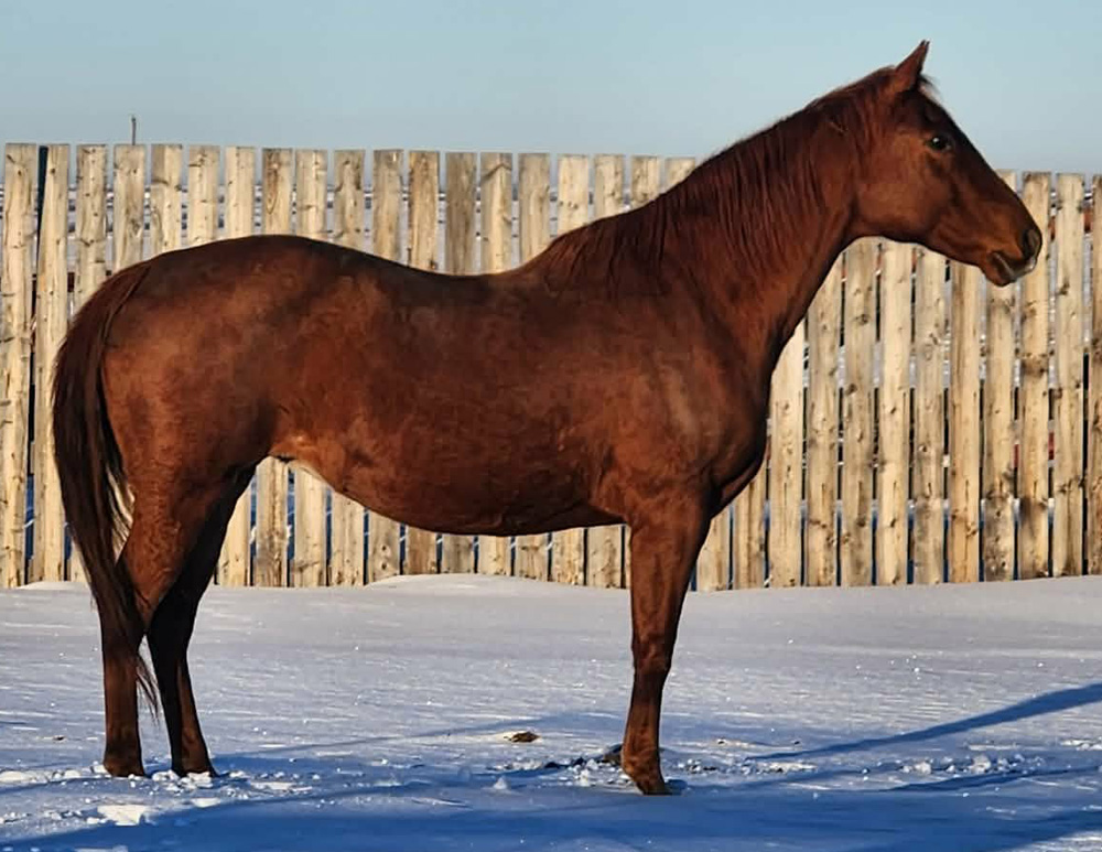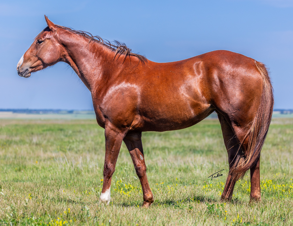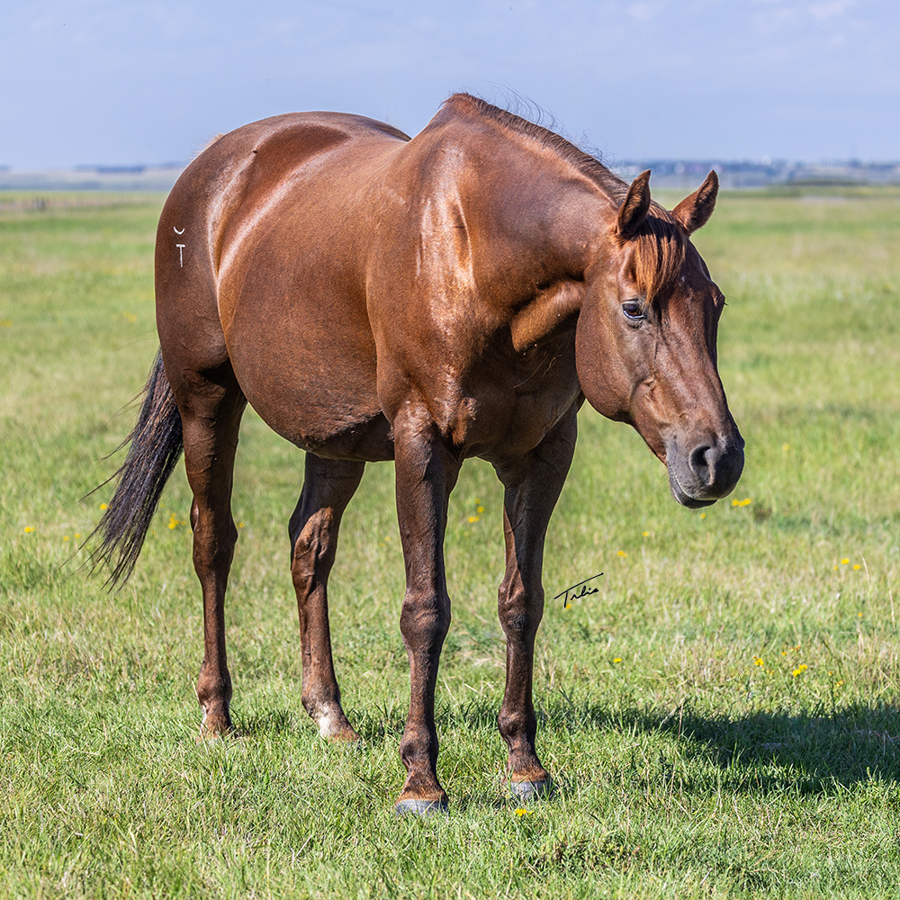 Sired by Ninety Nine Goldmine (SI-90/ROM/AAA, LTE $21,942, OE $1M+), whose progeny have placed him to the top of the leading sire charts year after year throughout Canada, and nationally with NFR qualifier and go round winner, RC Back In Black (OE $767,000+). In foal to R Ace of Spades for a 2026 foal.