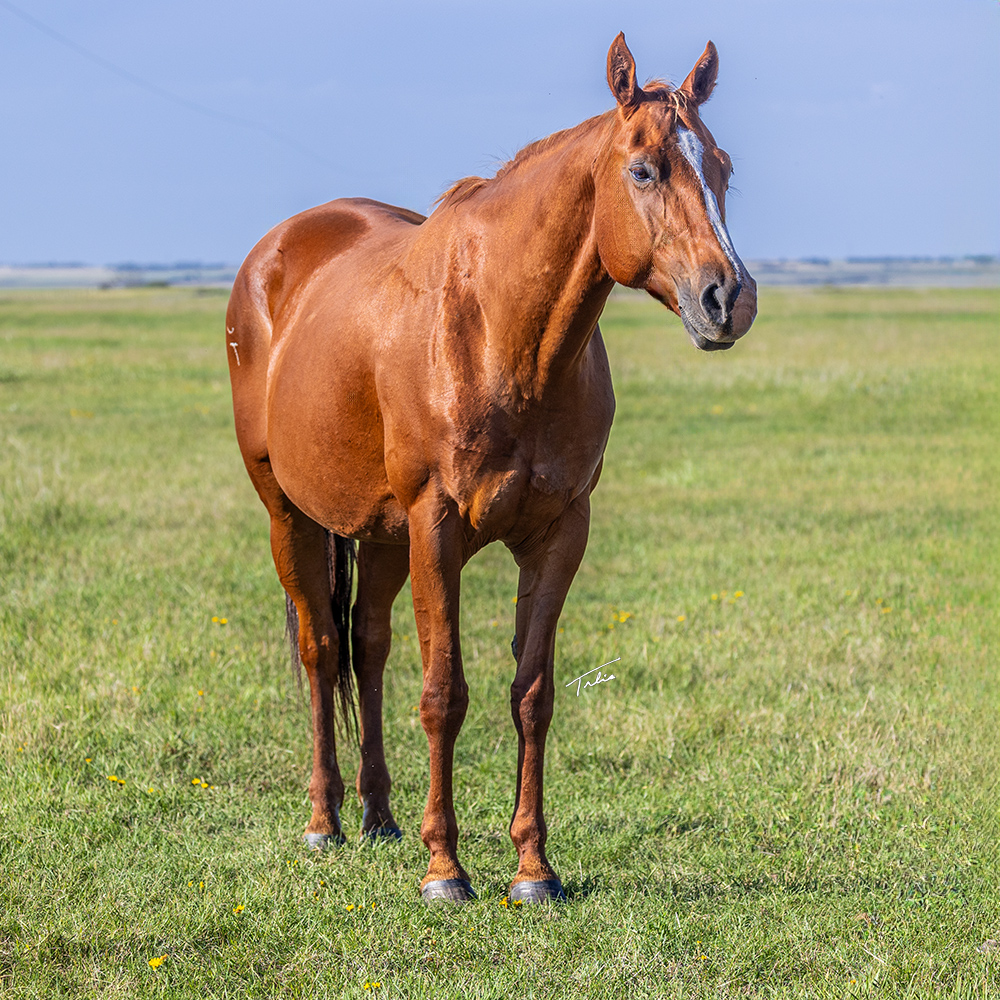 "Kinda" is a multiple award winner and money earner. Her accomplishments include a Big Valley rodeo win; set an arena record in Delbern; was a CGRA finalist; and ranked in the Top 12 at the Stettler Futurity. Sired by Fast Moon Chic (Marthas Six Moons, the Nation's #7 Leading Barrel Sire of the Decade, and out of World Race Champion Producer, Chicks Gay, a half-sister to Tiny's Gay) a proven sire of Barrel Futurity Champions and Barrel Race Money Earners. Her damside boasts big names in the Quarter Horse (Doc Olena) and Thoroughbred (Bold Ruler) worlds, just off her papers. In foal to TPR StreakN Goldmine for a 2026 foal.